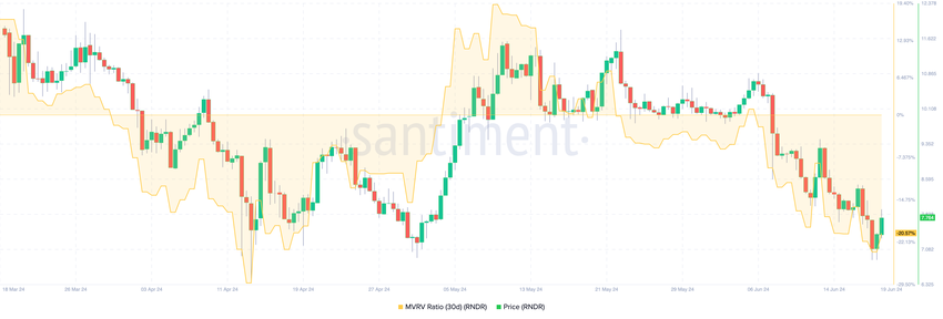 Enligt Santiment är RNDR:s 30-dagars MVRV-förhållande -20,57%, vilket indikerar att tokenen är på en plats som kan leda till ett rally. Förra gången den 29:e mest värdefulla kryptovalutan närmade sig ett sådant område gick priset från 7,64 dollar till 9,28 dollar.