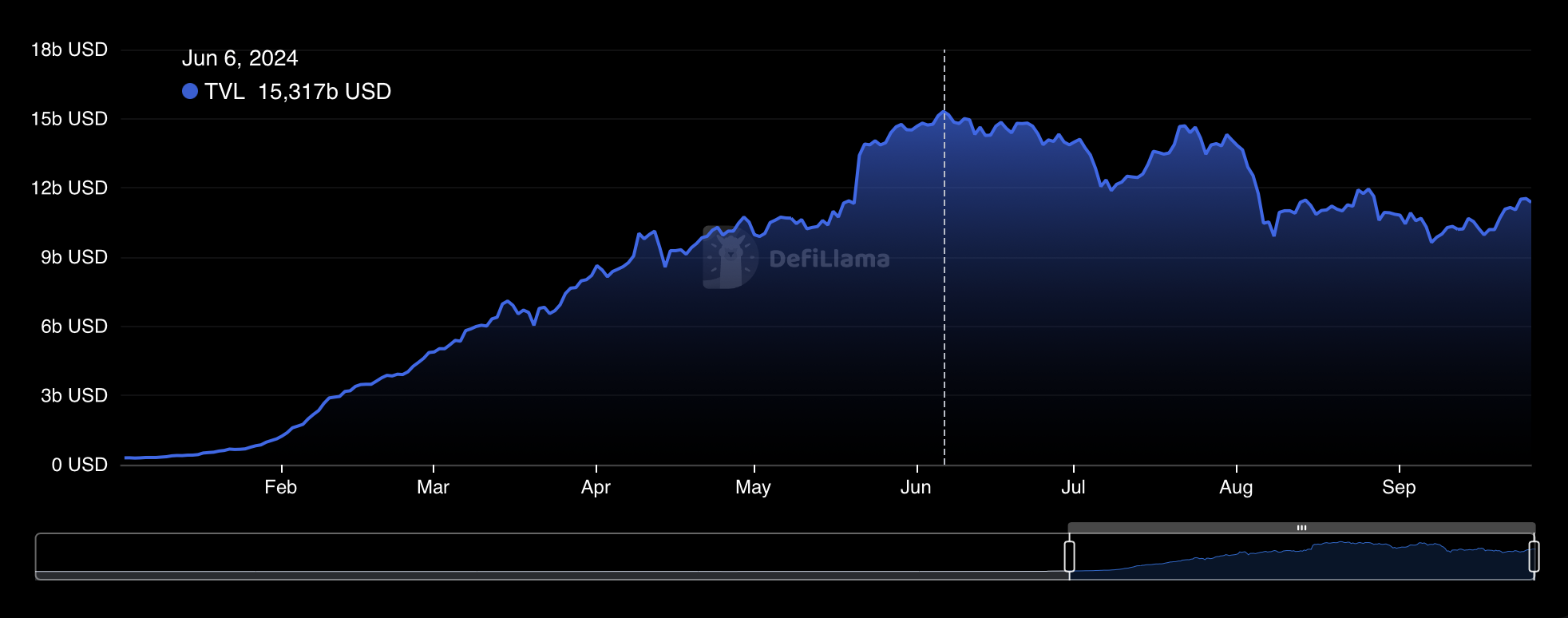 Denna process har låst upp betydande inkomstpotential, vilket driver återinsatsens uppgång. Under 2024 såg vätskeåterinsatstoken (LRTs) en enorm tillväxt på 4 900% i Totalt Värde Låst (TVL), och översteg 15 miljarder USD från bara 280 miljoner USD i början av 2024.