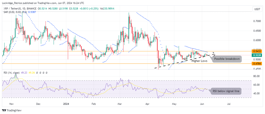 Med RSI fortfarande under medelnivån på 50 har björnarna överhanden och en uppdelning kan vara nära förestående för Ripple-priset. En förlust av stöd på grund av den stigande trendlinjen kan sätta XRP på en klippa, med möjlighet att rulla över för att ge en annan köpmöjlighet på $ 0.5000 psykologisk nivå.