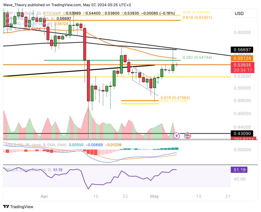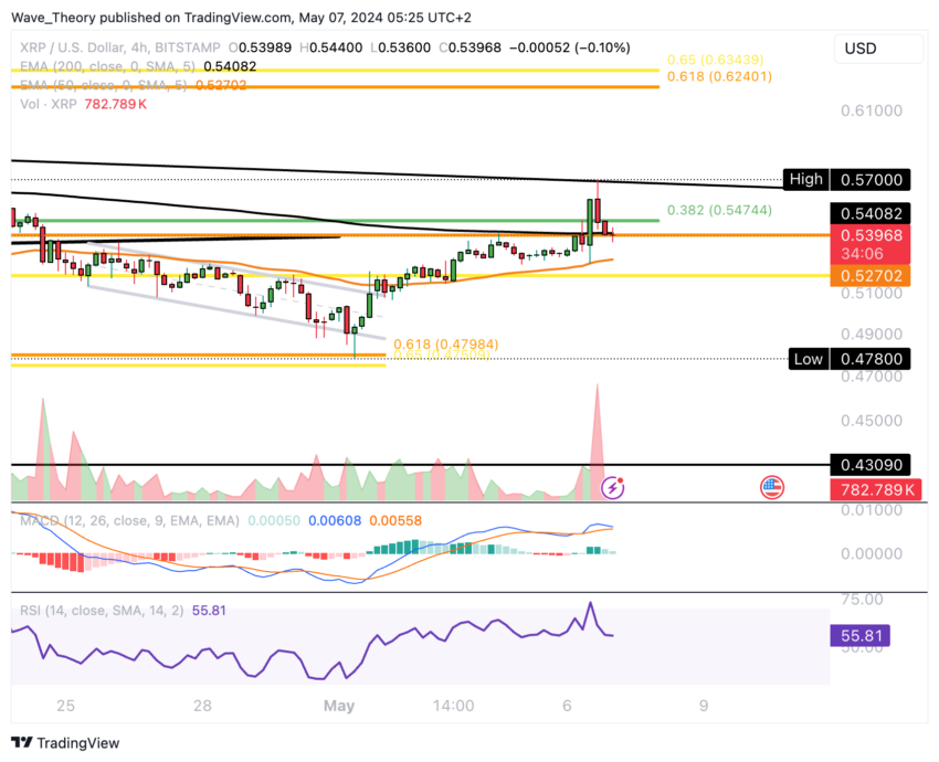 För ungefär en vecka sedan fann XRP stöd i det gyllene förhållandet runt $0,475, vilket utlöste en hausseartad rebound. Därefter påbörjade Ripple en uppåtgående bana och nådde motstånd vid 200-dagars EMA nära 0,567 $ igår.