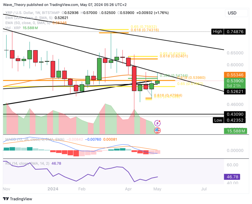 XRP stöter för närvarande på anmärkningsvärt motstånd vid .382 Fib-nivån runt $ 0,55, med 50-veckors EMA som ger ytterligare motstånd på denna nivå.