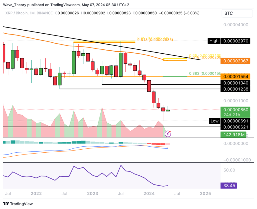 Ripple kan komma att sjunka ytterligare mot BTC tills den når stödnivån på cirka 0,0000062 BTC. Medan MACD-linjerna för närvarande visar en bearish crossover, finns det indikationer på en bullish uppgång i MACD-histogrammet för den aktuella månaden.