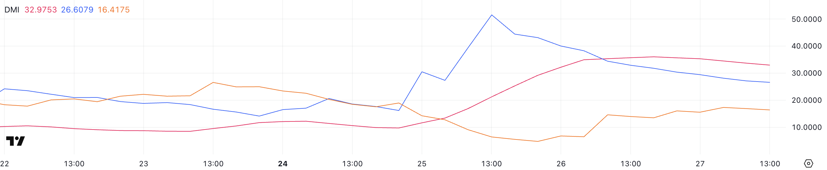 MOVEs DMI-diagram visar att dess Average Directional Index (ADX) är på 32,97, stabilt sedan igår efter att ha stigit från bara 9,74 för två dagar sedan.