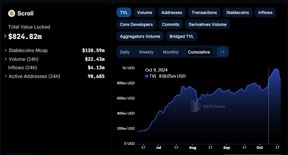Data från DefiLlama visar att mellan den 9 och 16 oktober hoppade Scrolls TVL upp med 157,70 miljoner USD. Det gick från 838,05 miljoner USD till 995,75 miljoner USD, vilket innebär en ökning på nästan 20% på en vecka. Dock var ökningen av Scrolls TVL kortvarig. Den har sjunkit sedan dagarna före ögonblicksbilden och registrerade 824,82 miljoner USD vid tidpunkten för skrivandet.