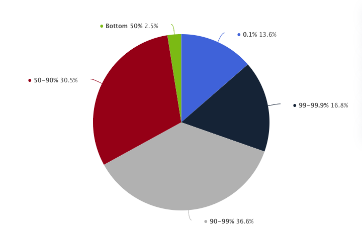 Enligt en rapport från Statista äger de 10 % rikaste i USA 67 % av nationens välstånd. I skarp kontrast äger de lägsta 50 % endast 2,5 %.