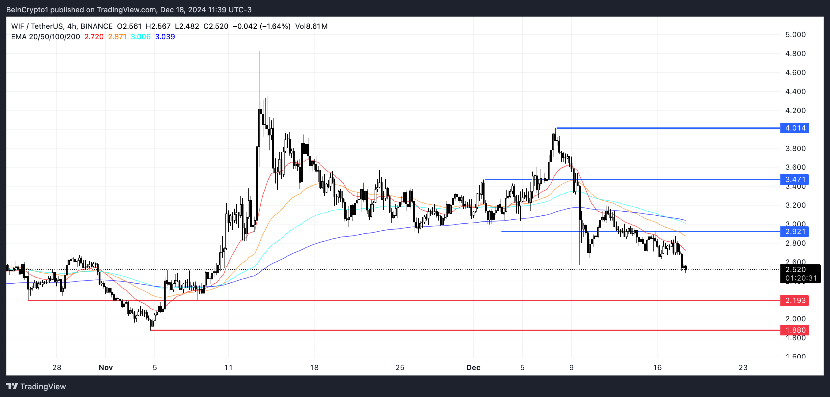 Om denna nivå inte håller kan WIF-priset sjunka ytterligare, och potentiellt nå 1,88 USD som nästa betydande stöd.