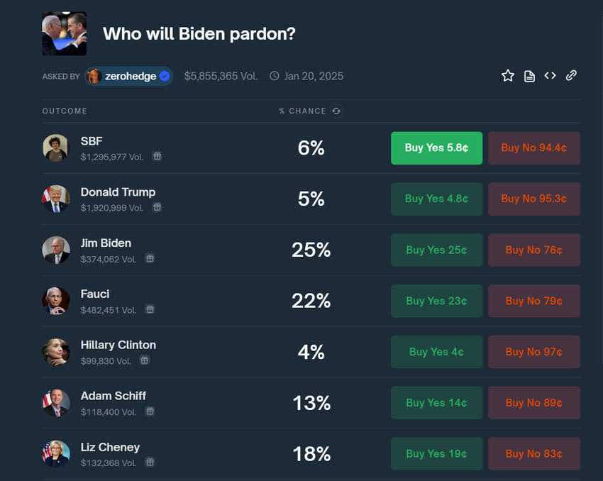 “Sam Bankman-Fried använde miljoner av stulna kundmedel för att finansiera politiska kampanjer. SBF gav nästan enbart till demokrater (98 %) vilket gjorde honom till den näst största dem-donatorn. Det finns nu en 12 % chans att Biden benådar honom,” förutspådde marknaden Kalshi på X (tidigare Twitter).