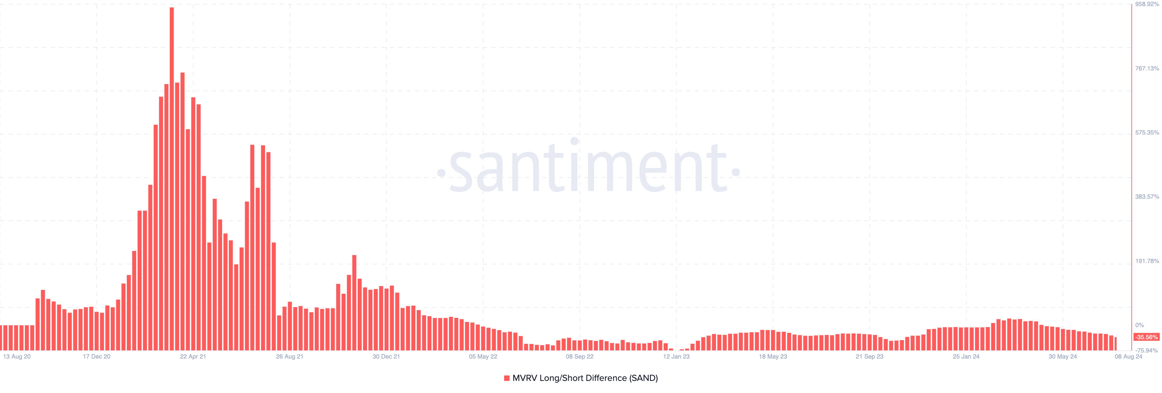 The Sandbox pris har stigit med cirka 6% under de senaste sju dagarna. Dock visar kedjedata att Market Value to Realized Value (MVRV) Long/Short Difference är -35,56%. Detta mått, som spårar marknadens lönsamhet, är avgörande för att identifiera björn- och tjurfaserna.