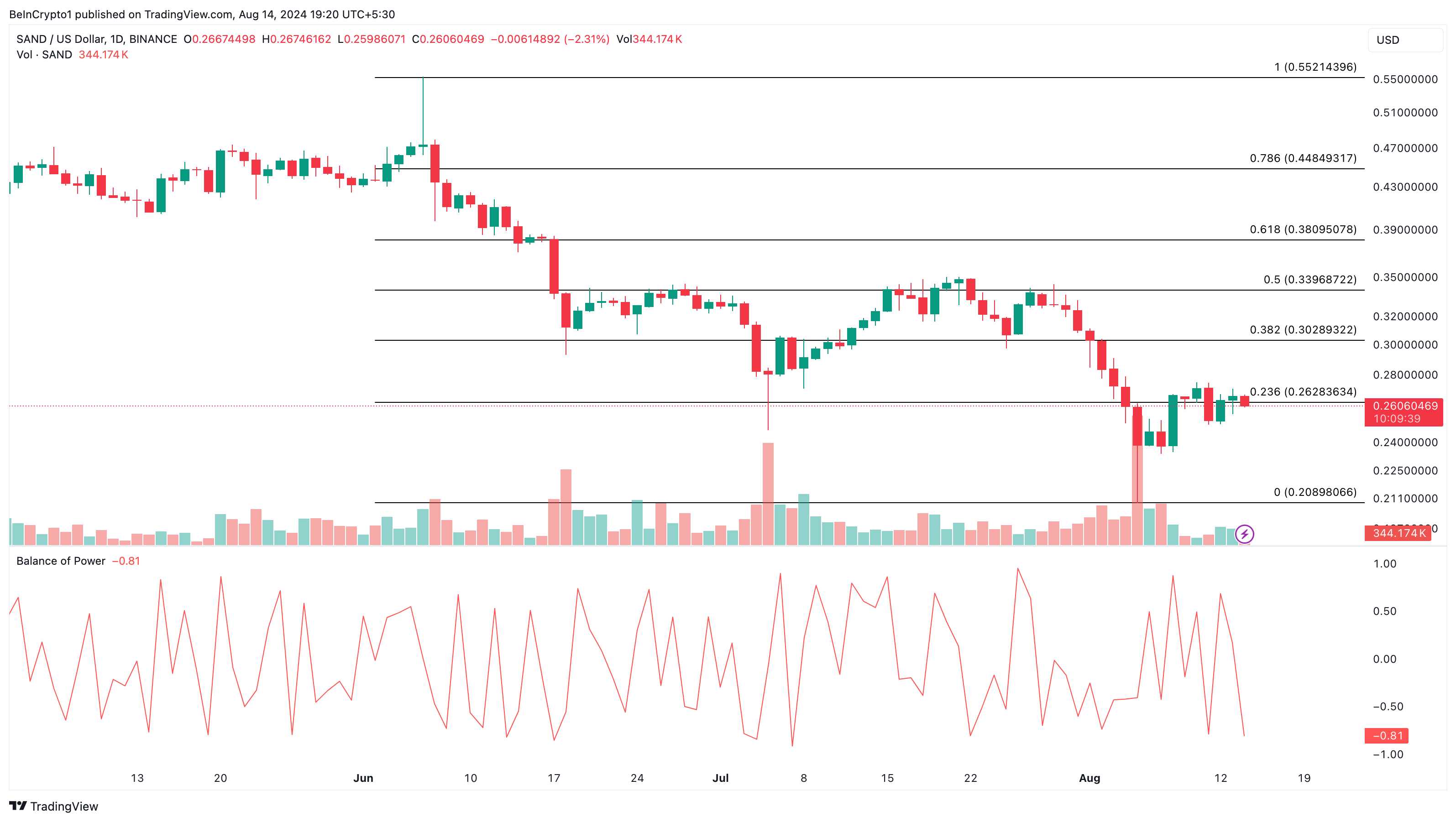 Teknisk analys, stödd av indikationer på SAND:s dagliga diagram, stämmer också överens med tecknen på kedjan. Till exempel har Balance of Power (BoP) sjunkit till -0,64. Denna prisbaserade indikator utvärderar den övergripande styrkan hos köpare och säljare på marknaden.