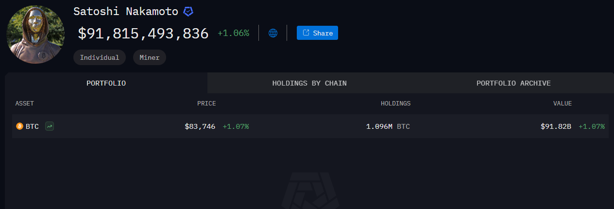 Satoshis plånbok, som tros innehålla 1,096 miljoner BTC, har varit orörd sedan tidigt 2010. Under det senaste decenniet har dess värde ökat mer än 333 gånger, nu över 91 miljarder USD.