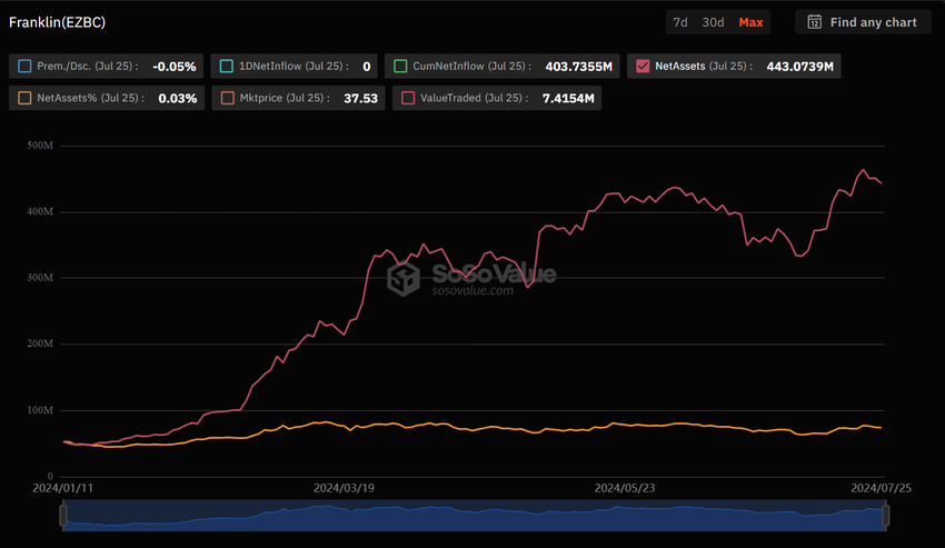 Å andra sidan har Franklin Templeton, med cirka 1,6 biljoner dollar i förvaltade tillgångar, nyligen expanderat till digitala tillgångar genom att bli spotemittenten av krypto-ETF:er i USA. Enligt SoSo Value-data har Franklin Templetons spot Bitcoin ETF, EZBC, för närvarande nettotillgångar på 403,74 miljoner dollar. Samtidigt förvaltar dess spot Ethereum ETF, EZET, tillgångar på 17,79 miljoner dollar.