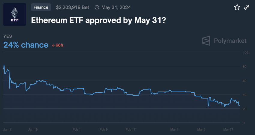 Dessutom har oddsen för godkännande minskat, med marknadsförutsägelser som visar en betydande nedgång i förtroendet. Enligt Polymarket har sannolikheten för ett Ethereum ETF-godkännande i maj sjunkit till 24%, en stark kontrast till 75% oddsen efter SEC: s godkännande av spot Bitcoin ETF: er i januari.