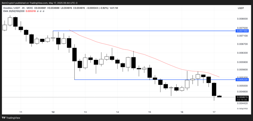 Men fortsatt nedåtgående tryck kan pressa DOOD under stödet vid 0,0040 USD, vilket markerar nya bottnar och ytterligare urholkar marknadens förtroende.