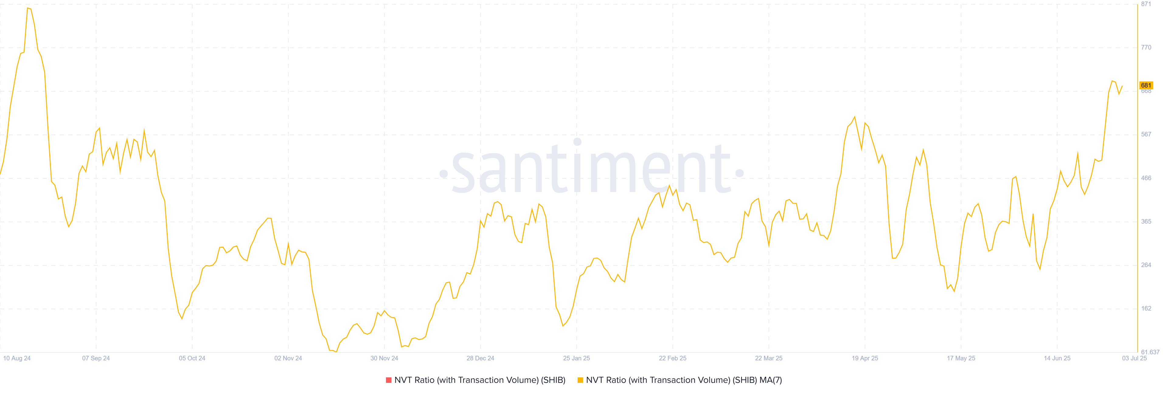 Network Value to Transaction (NVT) för Shiba Inu har nyligen nått en 11-månaders högsta nivå. Denna ökning tyder på att nätverkets värdering överstiger dess transaktionsaktivitet, vilket är ett tecken på att tillgången blir övervärderad.