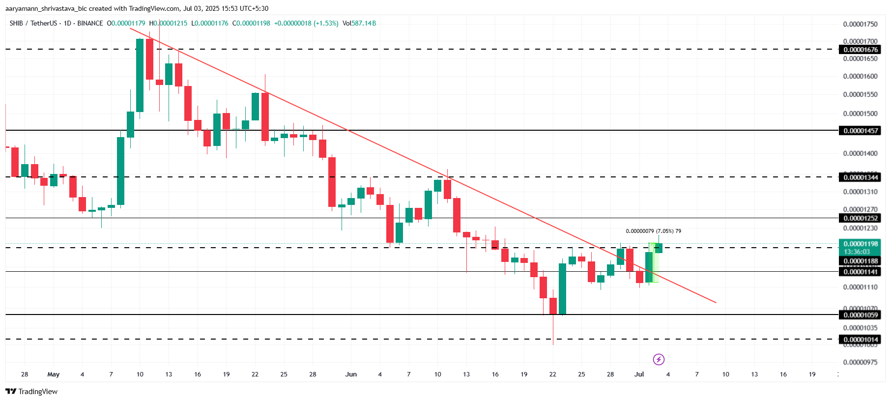 SHIB testar för närvarande nivån 0,00001188 USD som potentiellt stöd. Men med tanke på övervärderingen och marknadssentimentet kan detta vara osannolikt. Beroende på hur marknaden justerar sig, kan SHIB konsolidera mellan 0,00001188 USD och 0,00001141 USD eller falla ytterligare till 0,00001059 USD.