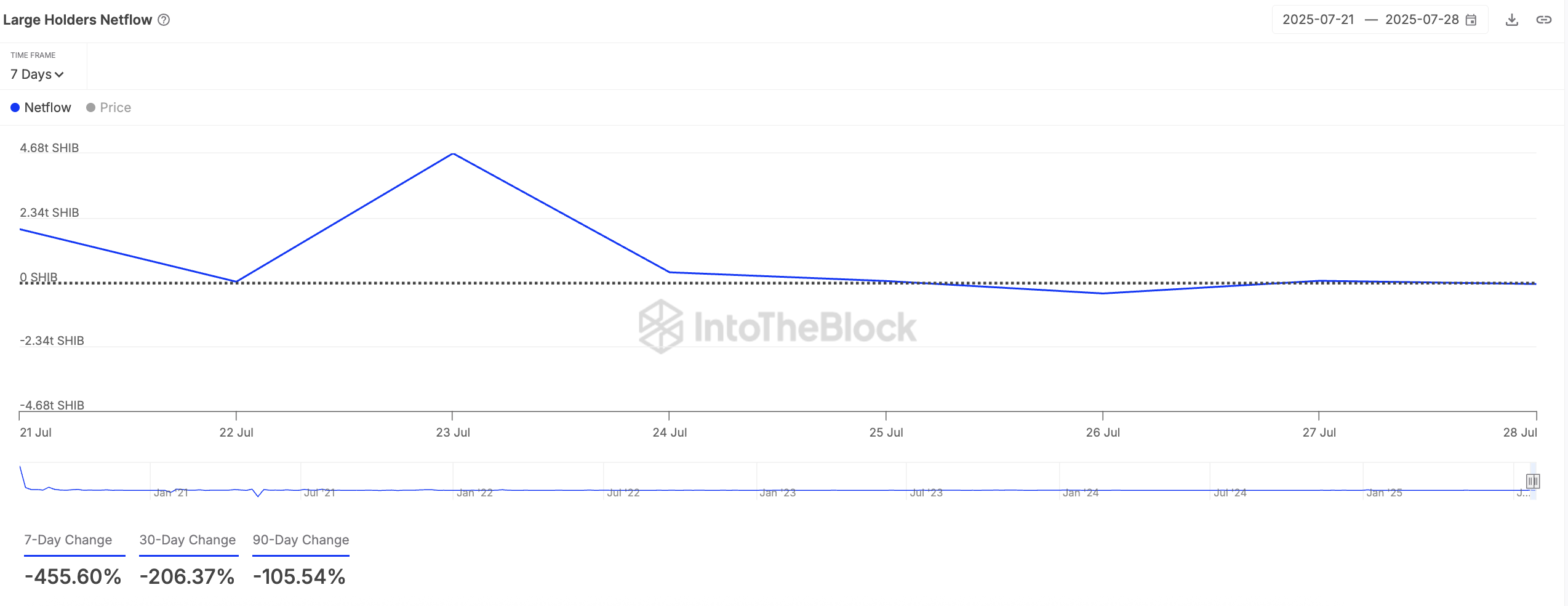 För SHIB sammanfaller nedbrytningen med en kraftig ökning av valförsäljningar. On-chain-data från IntoTheBlock visar en 456% minskning i stora innehavares nettoflöde under den senaste veckan, vilket bekräftar att stora investerare lämnar sina positioner och realiserar vinster.