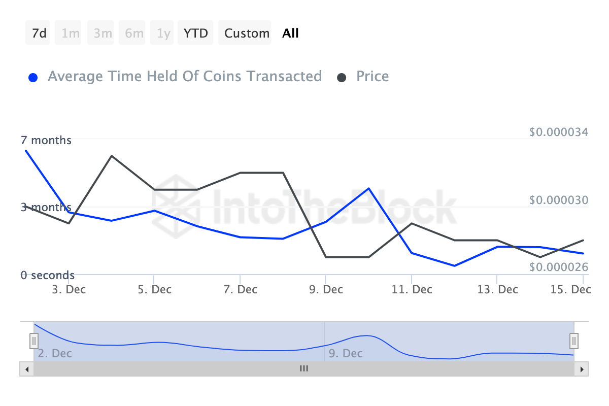Vidare visar data från IntoTheBlock en betydande minskning i SHIB:s Coins Holding Time, som spårar hur länge en kryptovaluta hålls utan att transaktioner eller försäljningar sker.