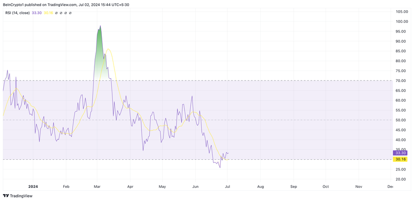 Vid 33,78 vid presstillfället signalerar SHIB:s RSI en uppgång i meme-myntets säljtryck.