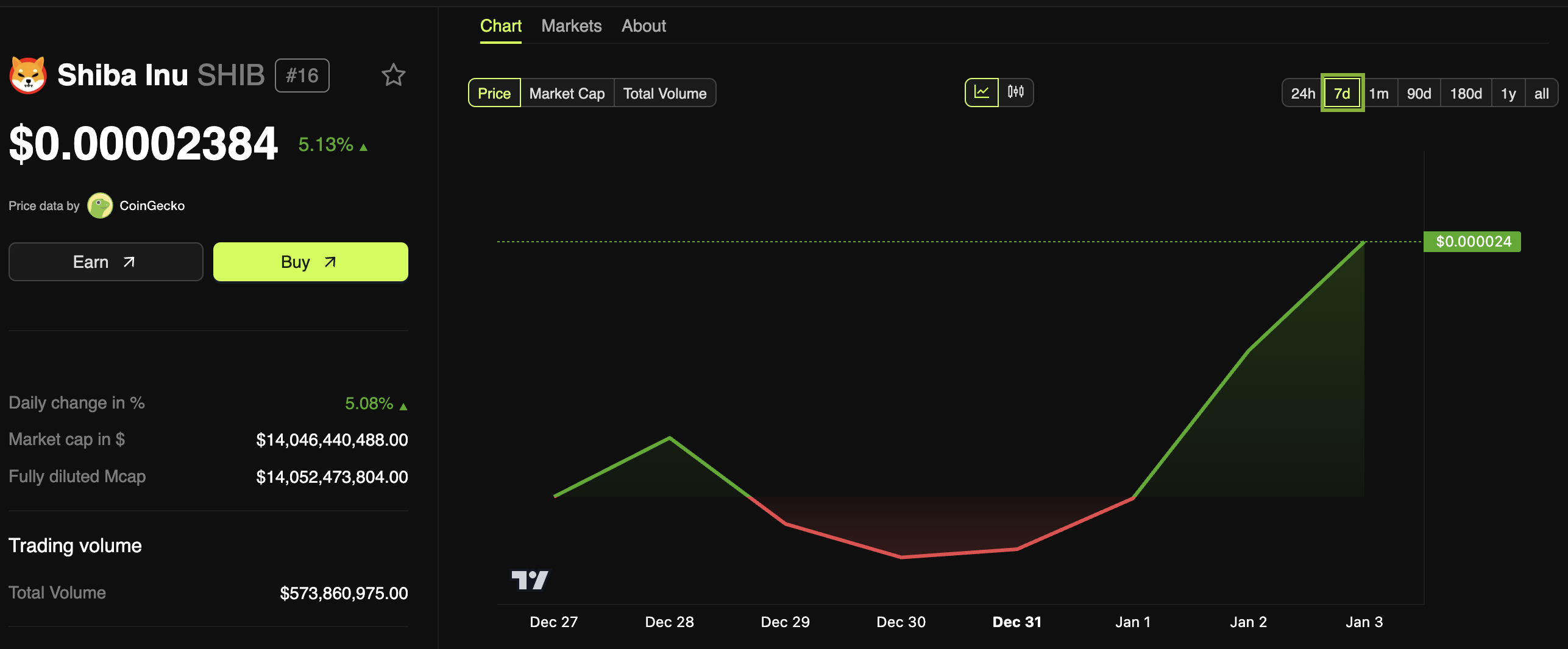 SHIB har nyligen genomgått en kaotisk prisperiod. Även om det började december med en nio månaders högsta nivå, orsakade betydande minskningar i handelsvolymen snabbt prisjusteringar. Trots detta återhämtar SHIB sig och har rört sig mot återhämtning de senaste dagarna.
