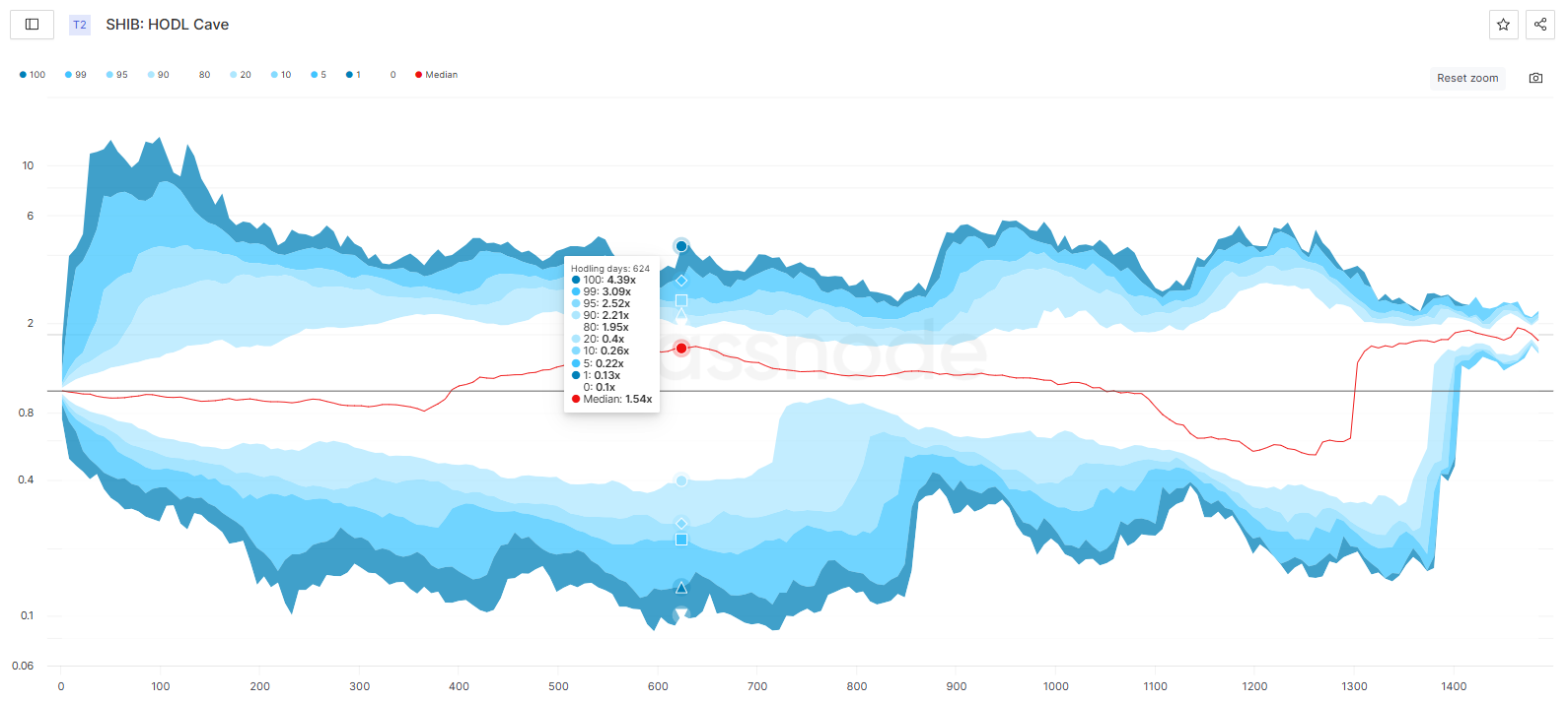 2-årsindikatorn för medelmyntålder, som spårar rörelsen av tokens under de senaste två åren, visar en ökning. Under de senaste två månaderna har endast ett försäljningstillfälle registrerats, vilket belyser SHIB:s långsiktiga innehavares fortsatta motståndskraft.