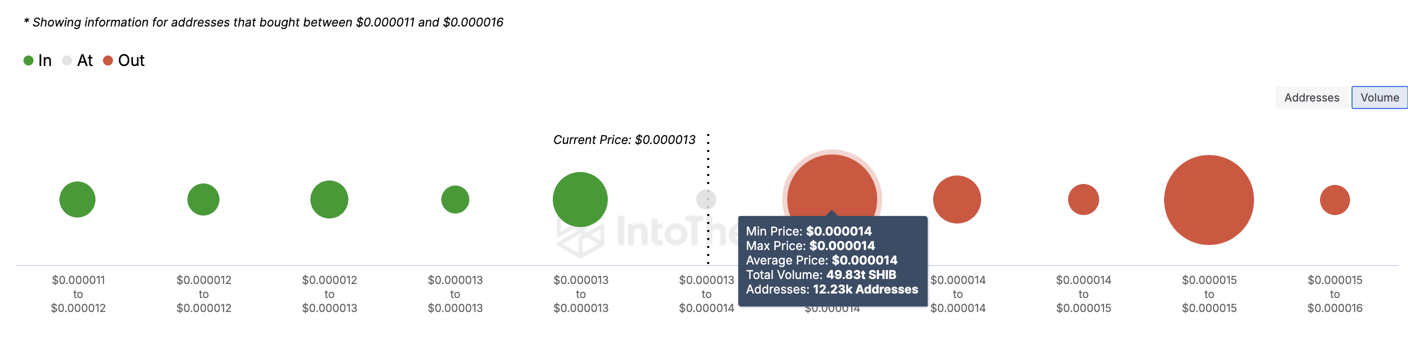 För SHIB överstiger den ackumulerade volymen runt 0,000014 USD 48 biljoner, betydligt högre än volymen som köpts mellan 0,000011 och 0,000013 USD. Med tanke på detta tillstånd kan SHIB:s pris uppleva ett motstånd när det försöker nå 0,000014 USD.