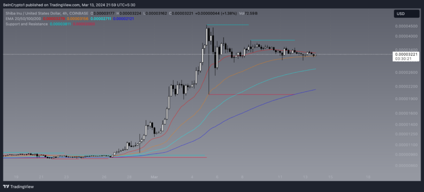 När man analyserar SHIB 4-timmarsdiagrammet blir det uppenbart att de exponentiella glidande medelvärdena (EMA) antyder ett tillstånd av marknadskonsolidering. Specifikt observeras 20-EMA att vara i närheten av både priset och 50-EMA. Denna anpassning indikerar att SHIB:s pris för närvarande rör sig i sidled, vilket återspeglar en period av obeslutsamhet på marknaden där varken köpare eller säljare har slutgiltig kontroll.