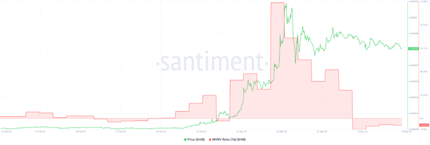 För SHIB, när priset började konsolideras, föll det kraftigt per dag i rad. Från den 4 mars till den 12 mars gick dess MVRV-kvot från 71% till -4,2%. Detta kan indikera att efter konsolideringen är innehavarna inte förlorade och kan fortsätta att hålla sin SHIB och förväntar sig att den snart kommer in i en ny tjurkörning igen.