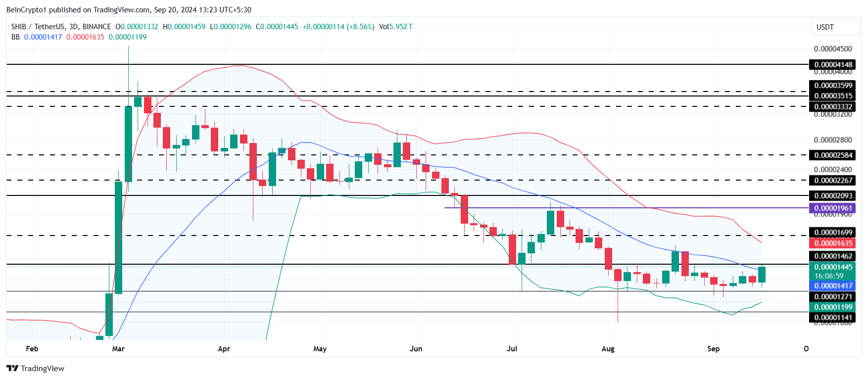 Shiba Inu siktar för närvarande på att bryta ut ur sin konsolideringsfas, med motstånd vid 0,00001462 USD och stöd vid 0,00001271 USD. Ett genombrott av detta motstånd kan skicka SHIB mot 0,00001699 USD, och att vända denna nivå till stöd kan utlösa en rally till 0,00001961 USD, vilket markerar en 40%-ig ökning.