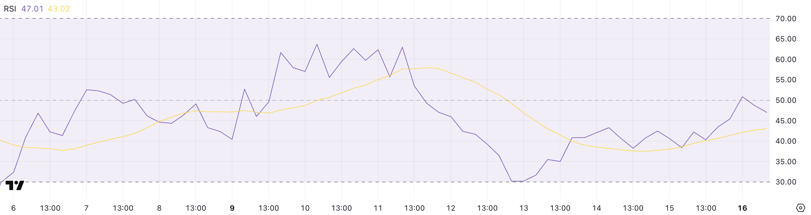 Värden under 30 pekar på översålda nivåer, medan värden över 70 tyder på överköpt territorium. Med SHIB:s RSI nu på 47, befinner sig tillgången i en neutral zon—varken översträckt eller kraftigt rabatterad.