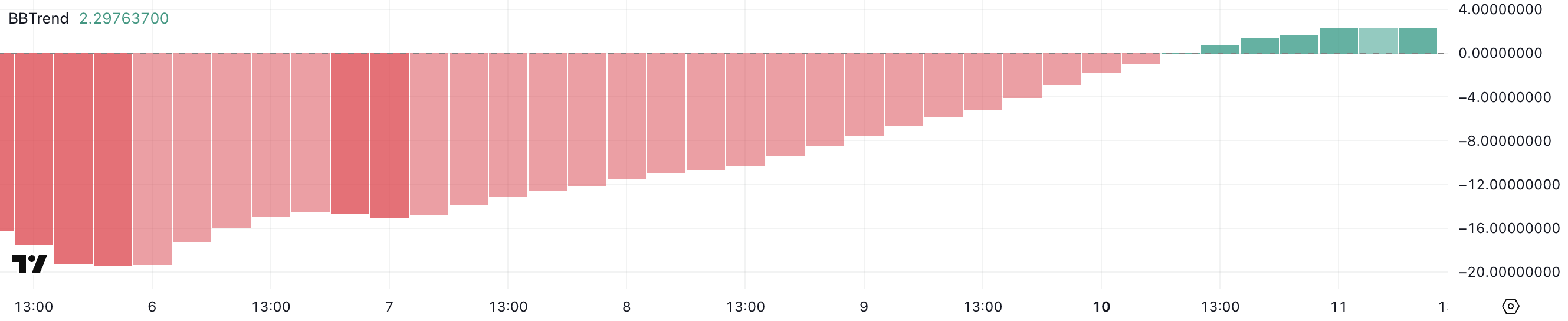 Shiba Inu BBTrend-indikator har blivit positiv, nu på 2,29, efter att ha varit sex dagar i rad i negativt territorium och nått en lågpunkt på -19,3 den 6 februari. BBTrend, eller Bollinger Bands Trend, är en volatilitetsbaserad indikator som hjälper till att bestämma styrkan och riktningen av en trend.