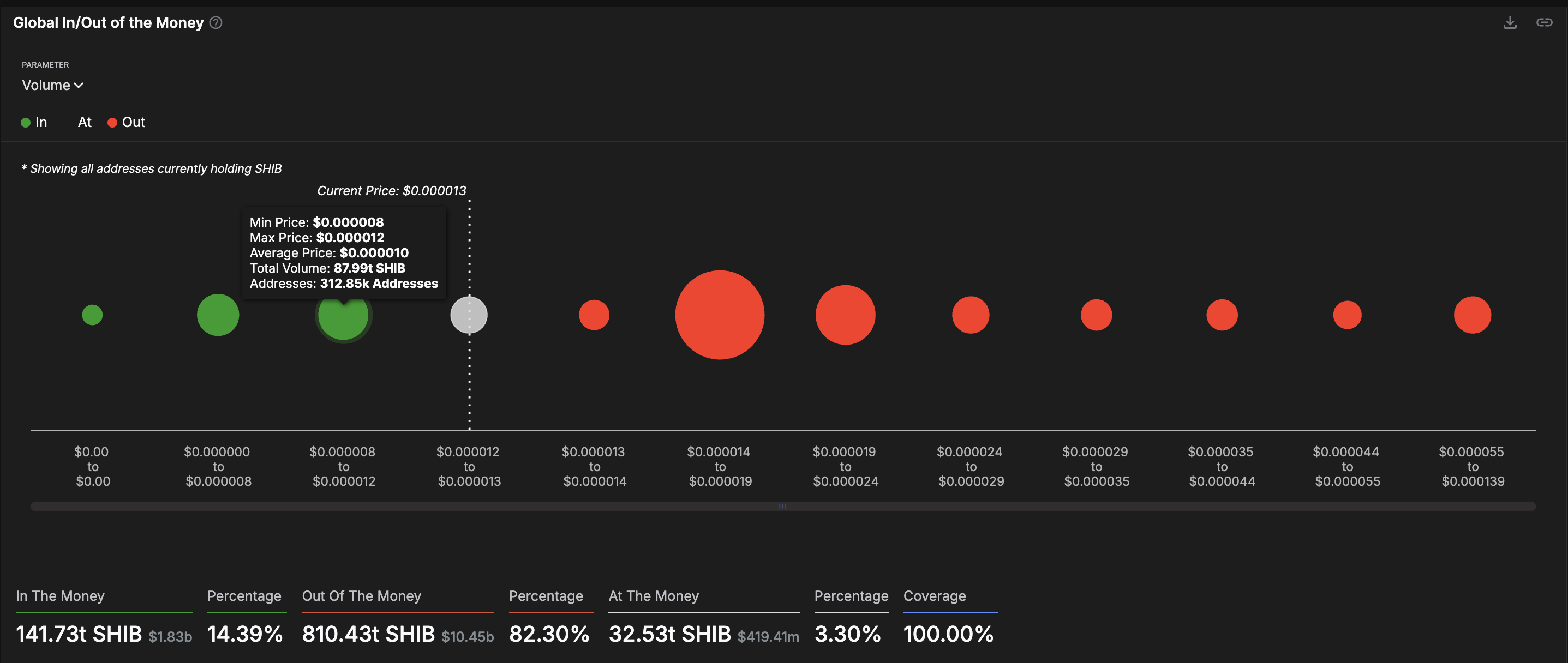 Enligt global in- och ut-ur-pengar-data utgör SHIB:s nuvarande prisintervall (0,000012–0,000013 USD) en svag stödzon. Endast 312 850 adresser håller SHIB i nästa lägre zon. Det betyder att om SHIB bryter under 0,000012 USD, kan det snabbt falla mot 0,000008 USD, eftersom det inte finns tillräckligt med köpare på lägre nivåer för att absorbera försäljningen.