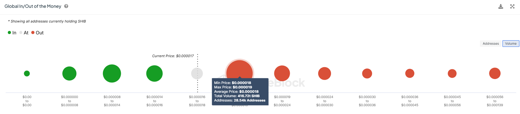 Den globala In/Out of the Money (GIOM)-indikatorn visar att ungefär 416 biljoner SHIB, värda över 7 miljarder USD, för närvarande väntar på vinster. Denna mängd SHIB köptes när priset låg mellan 0,00001800 och 0,00001900 USD. Således krävs en ökning på 25% för att återföra denna tillgång till vinst.