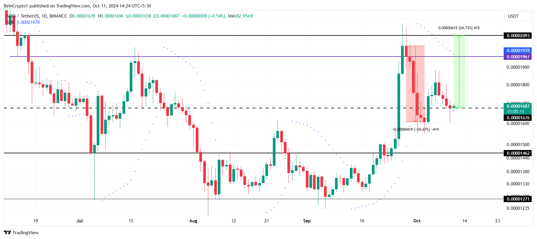 Shiba Inu handlas för närvarande till 0,00001687 USD och testar stöd vid 0,00001676 USD. Ett lyckat studs från denna nivå kan skicka priset mot 0,00001961 USD, återhämta förlusterna som uppstod under septembers 20%-iga nedgång. Att nå denna punkt skulle återställa en del av den förlorade marken och bringa ny optimism till marknaden.