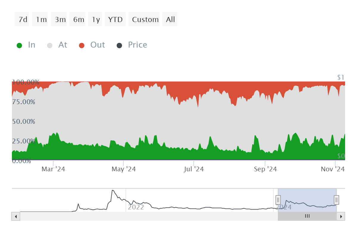 På en bredare skala reflekterar Shiba Inus makromomentum viss försiktighet. Den nuvarande fördelningen av aktiva adresser visar att ungefär 30% av SHIB-innehavarna är i vinst.