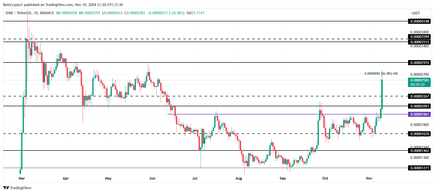 För närvarande handlas till 0,00002583 USD, Shiba Inus senaste prisutveckling speglar bredare marknadsoptimism. Meme-myntet siktar nu på att röra sig mot 0,00002976 USD, en kritisk motståndsnivå. Om SHIB lyckas vända detta motstånd, kan det nå 0,00003000 USD, ett psykologiskt betydande pris som skulle ytterligare stärka dess position.