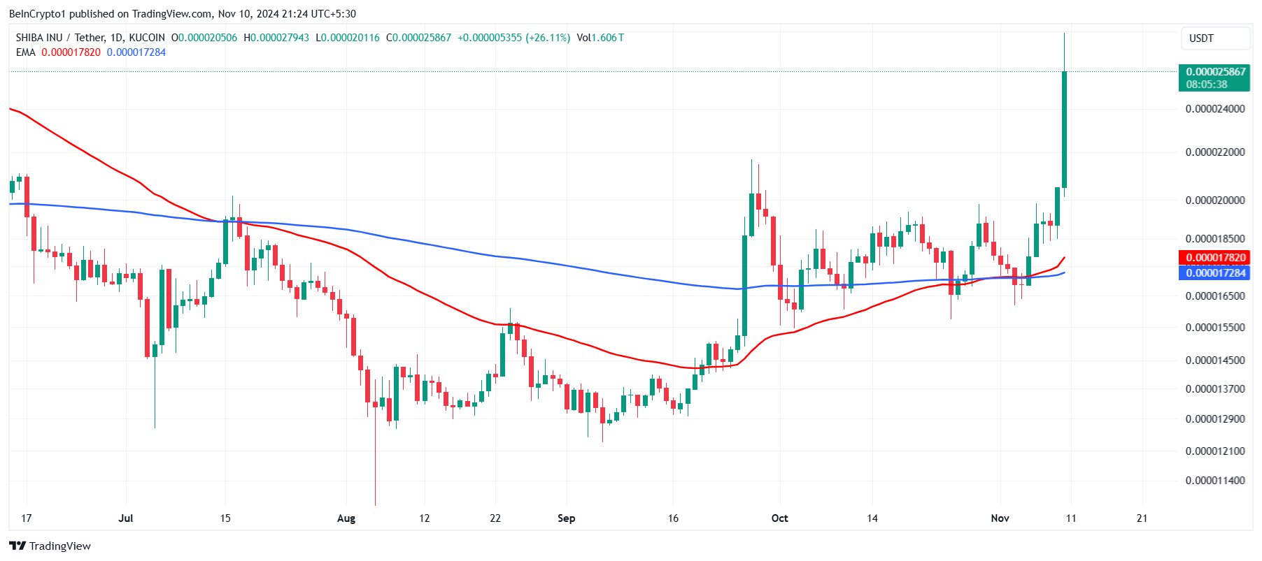 Shiba Inus pris har stigit med 36% under de senaste 24 timmarna och lett till ett optimistiskt “Golden Cross”-mönster. Det 50-dagars EMA (Exponentiellt Glidande Medelvärde) korsade över det 200-dagars EMA, vilket vände på effekterna av det “Death Cross” som sågs för tre månader sedan. Detta mönster har historiskt markerat en vändpunkt, avslutat SHIB:s senaste problem och antyder en ytterligare tillväxtpotential för meme-myntet.