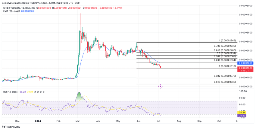 SHIB:s stadiga prisnedgång har fått priset att falla under sitt 20-dagars exponentiella glidande medelvärde (EMA), som mäter tillgångens genomsnittliga pris under de senaste 20 handelsdagarna.