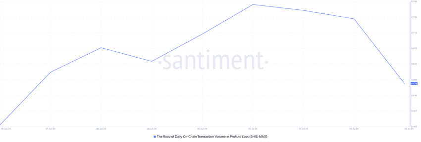 En analys av altcoinens förhållande mellan daglig transaktionsvolym i vinst och förlust, med hjälp av ett sju dagars glidande medelvärde, visar att för varje SHIB-transaktion som har resulterat i en förlust under den senaste veckan har endast 0,57 transaktioner varit lönsamma.