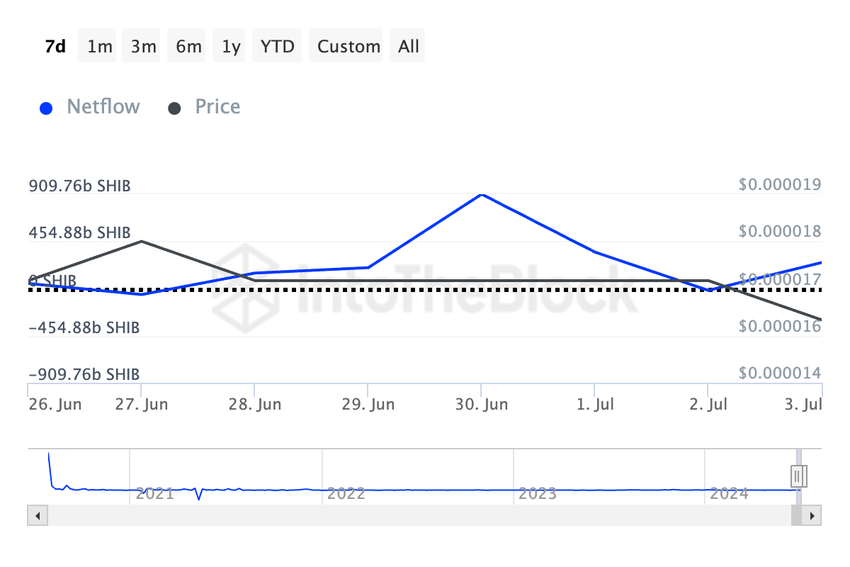 Det ledande meme-myntet Shiba Inu (SHIB) har sett en betydande nedgång i flödet av stora mynt till börserna under den senaste veckan.