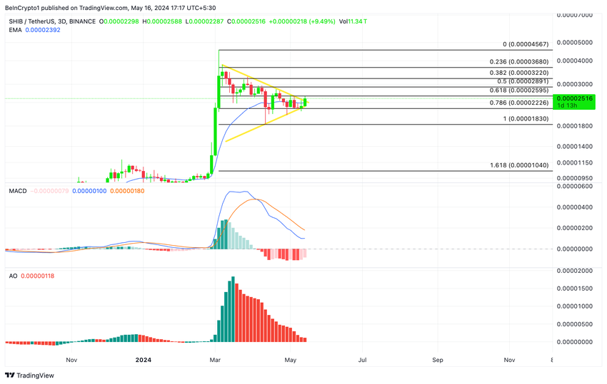 Om försäljningsaktiviteten ökar kan SHIB: s pris bryta under triangelns nedre trendlinje, som har bildat stöd för handel på 0,00002535 $.