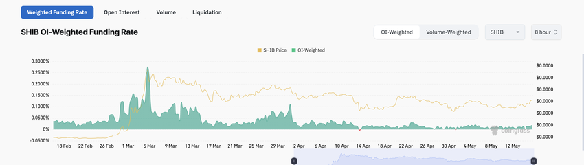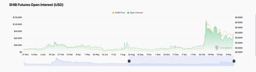 På 77,26 miljoner dollar i skrivande stund har meme-myntets öppna intresse ökat stadigt med 38% sedan början av denna månad. På sin nuvarande nivå ligger SHIB: s futures öppna intresse på det högsta sedan 14 april.