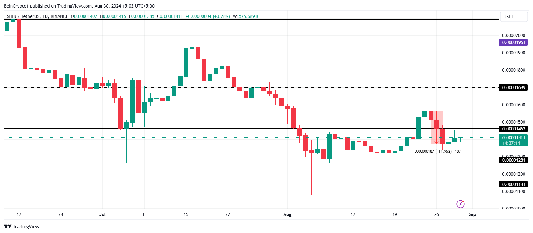 Sedan månadens början har Shiba Inu (SHIB) haft svårt att stänga över motståndsnivån på 0,00001462 USD.
