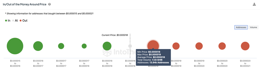 Ett stort kluster av adresser i pengarna kan stödja priset. Dessutom kommer ett stort kluster av adresser av pengarna att vara en motståndspunkt. För SHIB visar IOMAP att 6 720 adresser köpte 413,41 biljoner SHIB-tokens till ett genomsnittligt pris på 0,000018 dollar.