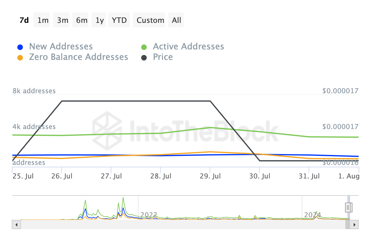 Vid presstillfället undersöker BeInCrypto de aktiva, nollsaldo och nya adresserna på Shiba Inus nätverk. Enligt IntoTheBlock har alla dessa mätvärden på kedjan minskat under de senaste sju dagarna.