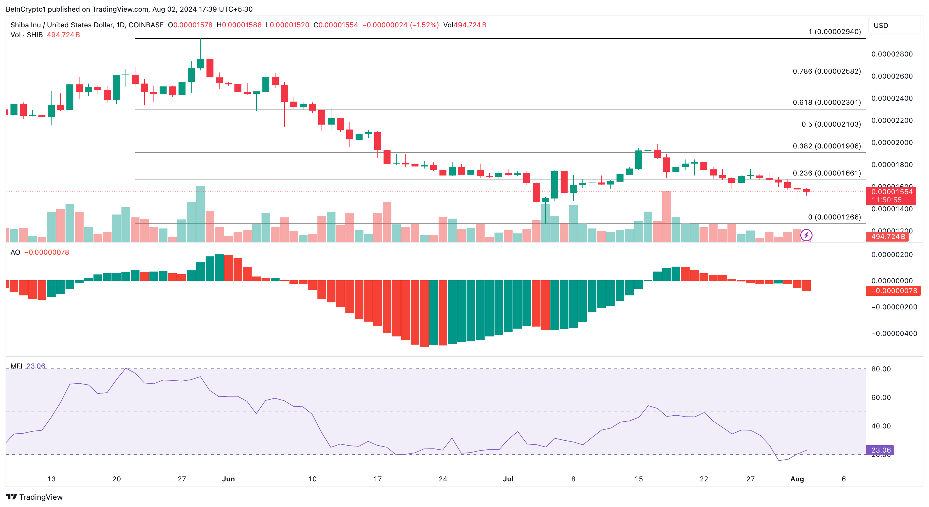 En nedgång liknande SHIB:s tyder dock på ett nedåtgående momentum. Därför, om AO-betyget fortsätter att sjunka, kommer SHIB:s pris också att sjunka. Om detta skulle dröja sig kvar kan tokens pris sjunka mot $0,000012.