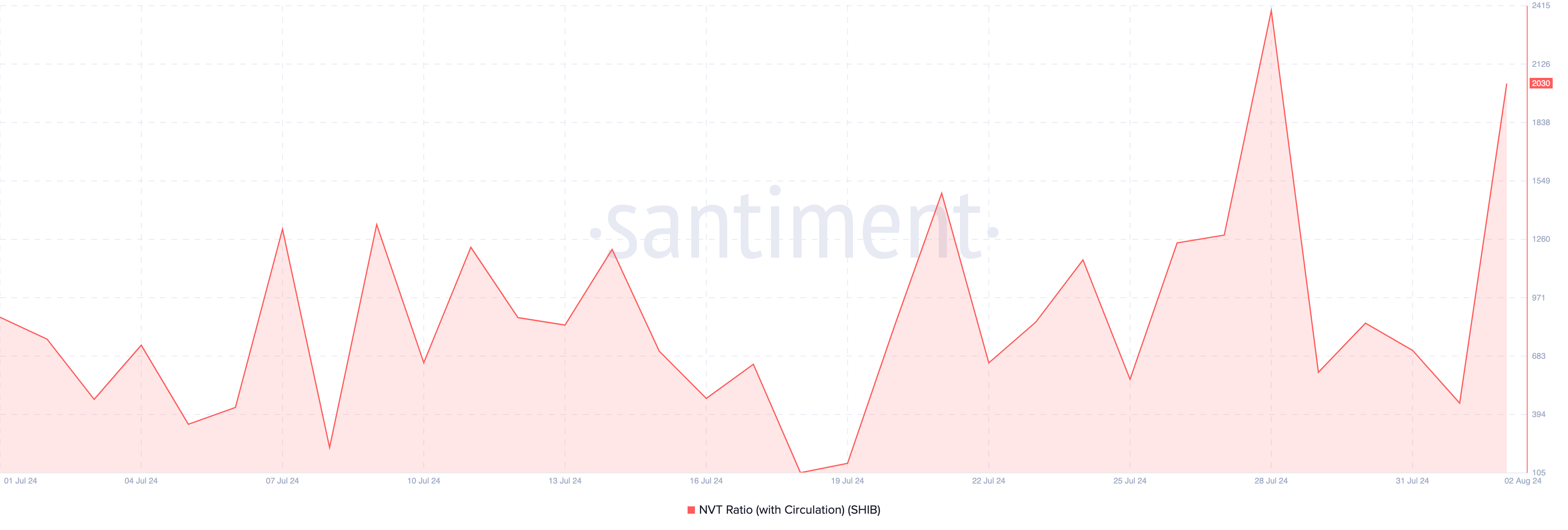 Låga NVT-tal indikerar att nätverket är undervärderat, eftersom transaktionerna är större än börsvärdet. Ett högt NVT-förhållande indikerar dock att nätverket är undervärderat och inte kan hantera en hög volym av transaktioner på ett effektivt sätt, vilket är fallet med SHIB.