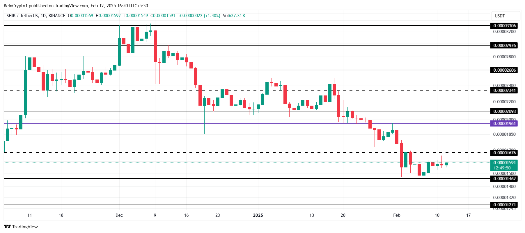 Shiba Inu är för närvarande prissatt till 0,00001591 USD och har fastnat under 0,00001676 USD-motståndet den senaste veckan. Myntet har genomgått en månadslång nedgång, vilket har pressat det till nuvarande prisnivå. Utan en betydande förändring i marknadens känsla är det osannolikt att SHIB bryter detta motstånd på kort sikt.