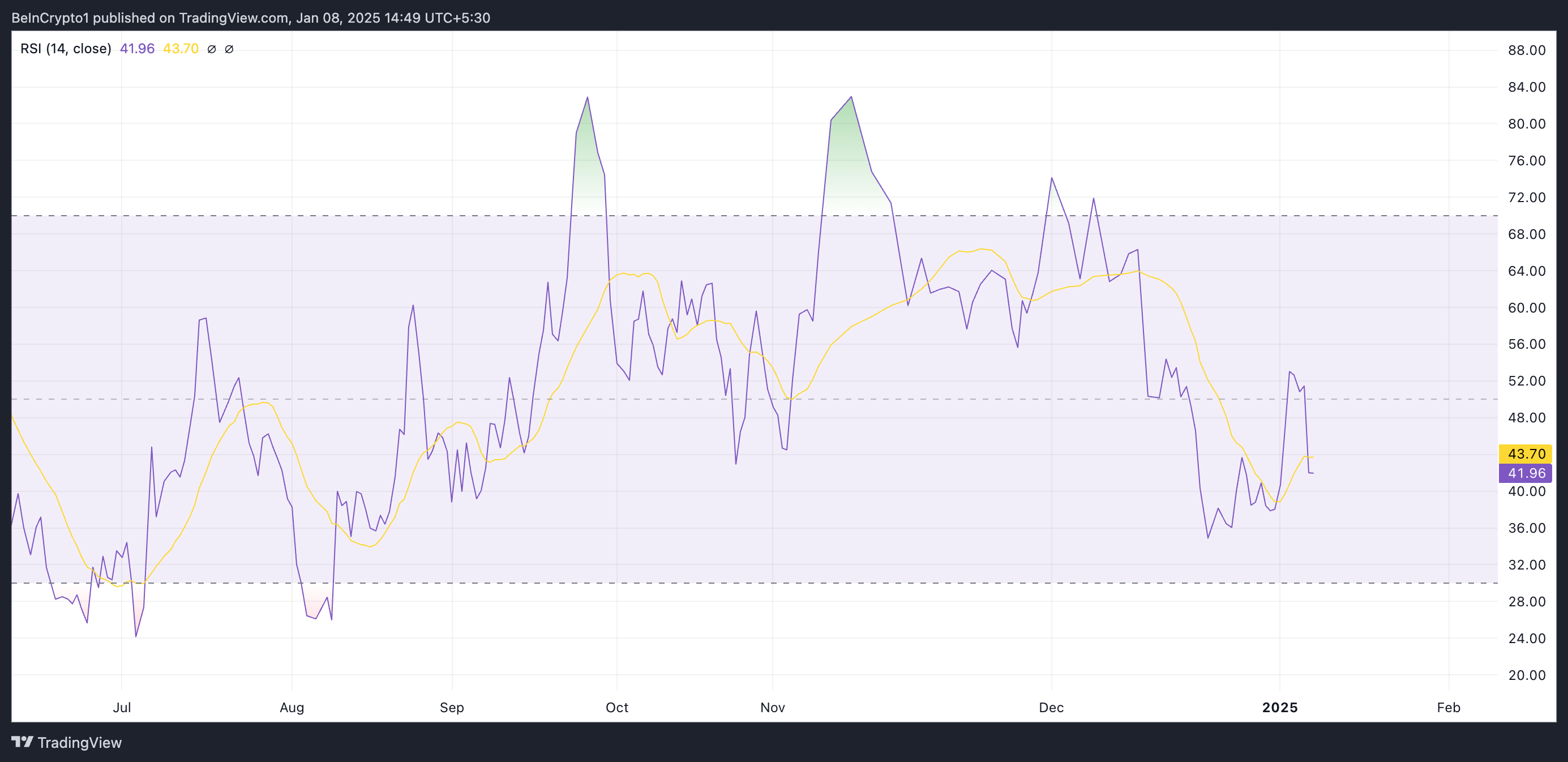 RSI-indikatorn mäter en tillgångs översålda och överköpta marknadsförhållanden. Den varierar mellan 0 och 100, där värden över 70 indikerar att tillgången är överköpt och kan sjunka. Å andra sidan, värden under 30 tyder på att tillgången är översåld och kan återhämta sig.