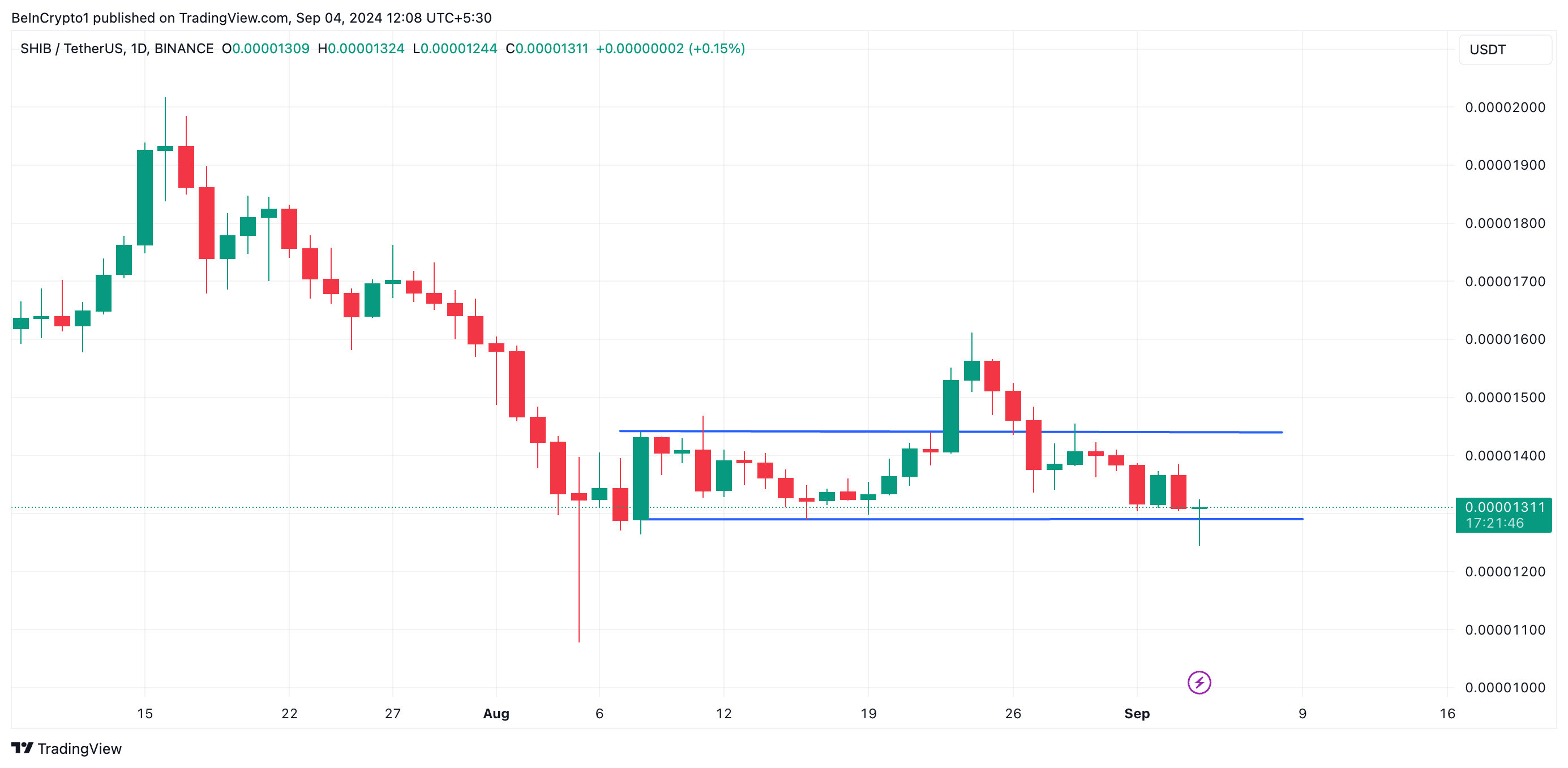 Shiba Inu (SHIB), en ledande meme-coin, har handlats inom ett horisontellt intervall sedan den 8 augusti. Även om den kort överskred den övre gränsen av detta intervall, lyckades den inte hålla sig kvar och föll tillbaka under motståndsnivån den 28 augusti.
