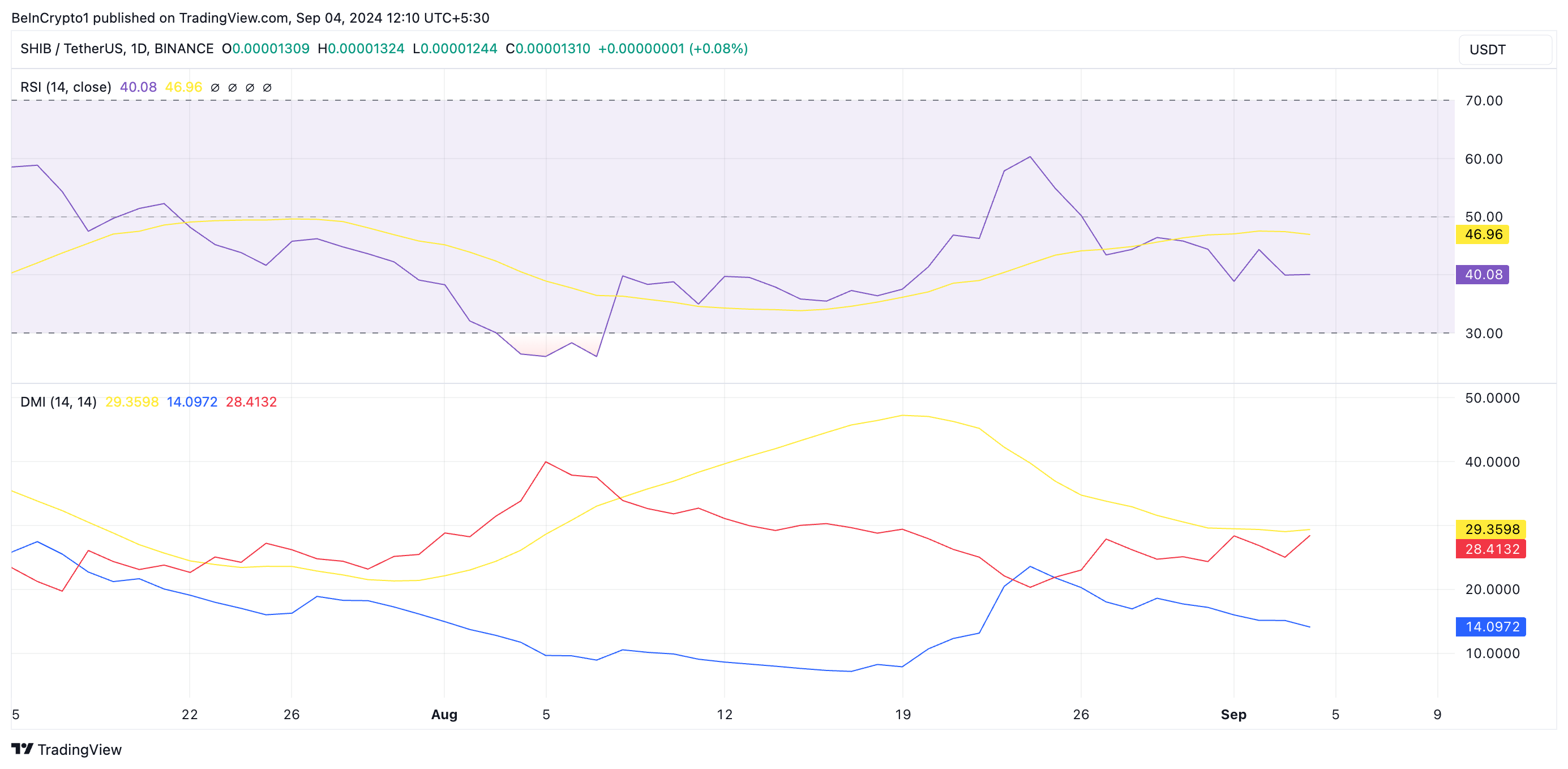 Tekniska indikatorer bekräftar denna baisseartade trend. På det dagliga diagrammet visar Shiba Inus riktningsrörelseindex (DMI) att dess positiva riktningsindex (+DI) (blå) är placerat under det negativa riktningsindexet (-DI) (rött).